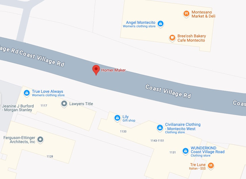 Homer Maker is located in the world famous Shopping destination Coast Village Road near the Tre Lune Restaurant and across the street from Montesano Deli. There are many neighboring cute boutique and fabulous places to dine for breakfast lunch and dinner including the new Bar Lou Montecito, Lucky's Steak House and our favorite happy hour location, The Honor Bar.